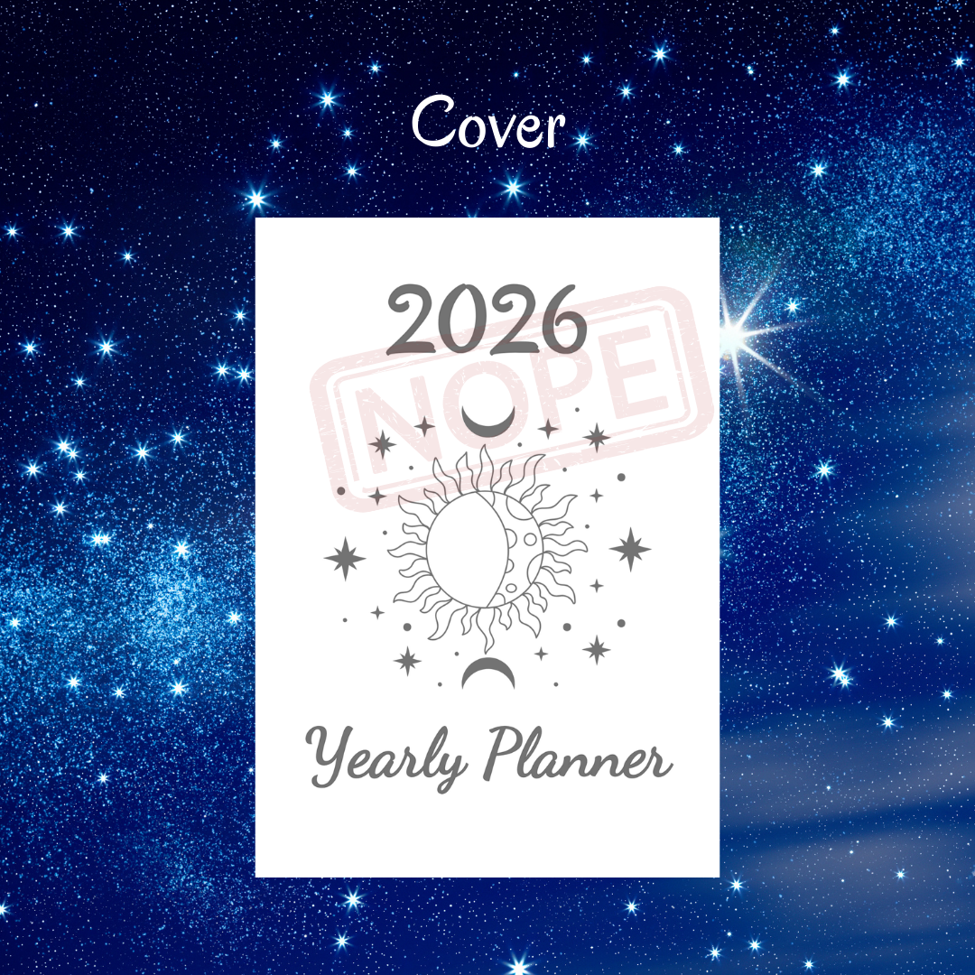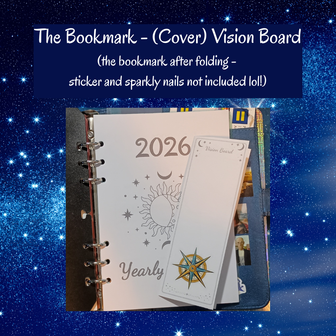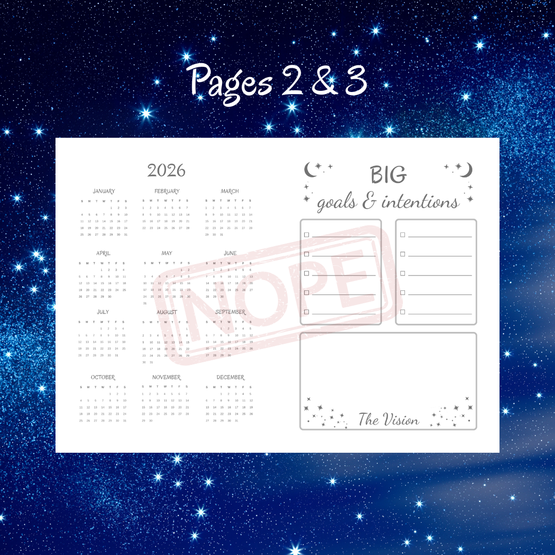 Manifest your best year with the 2026 Celestial Alignment Yearly Planner! A5 printable pages featuring a calendar, floating vision board, and monthly goals.