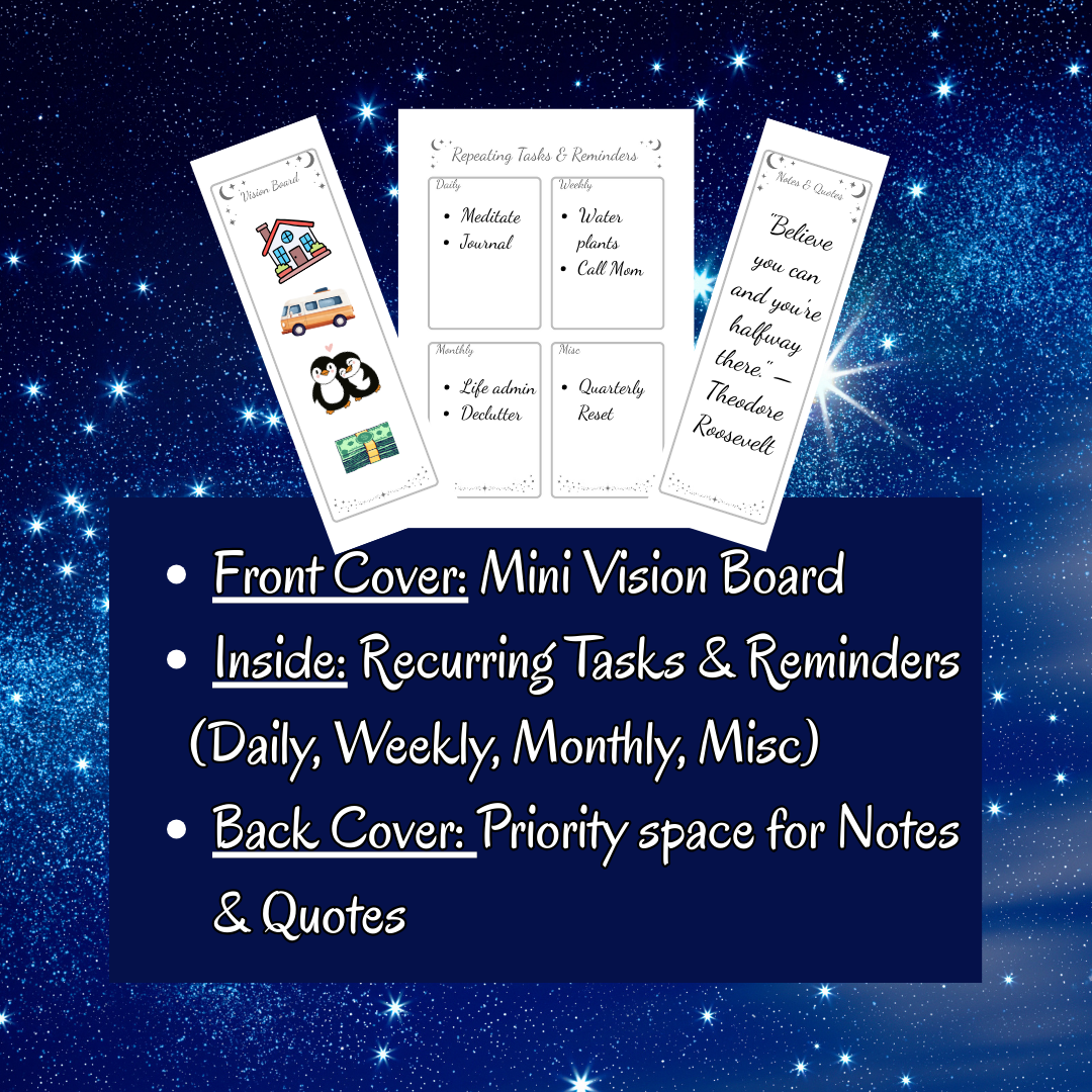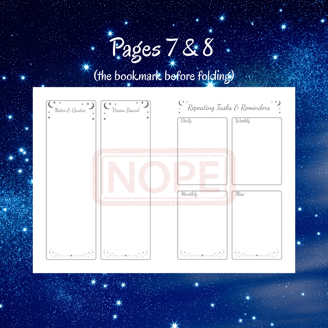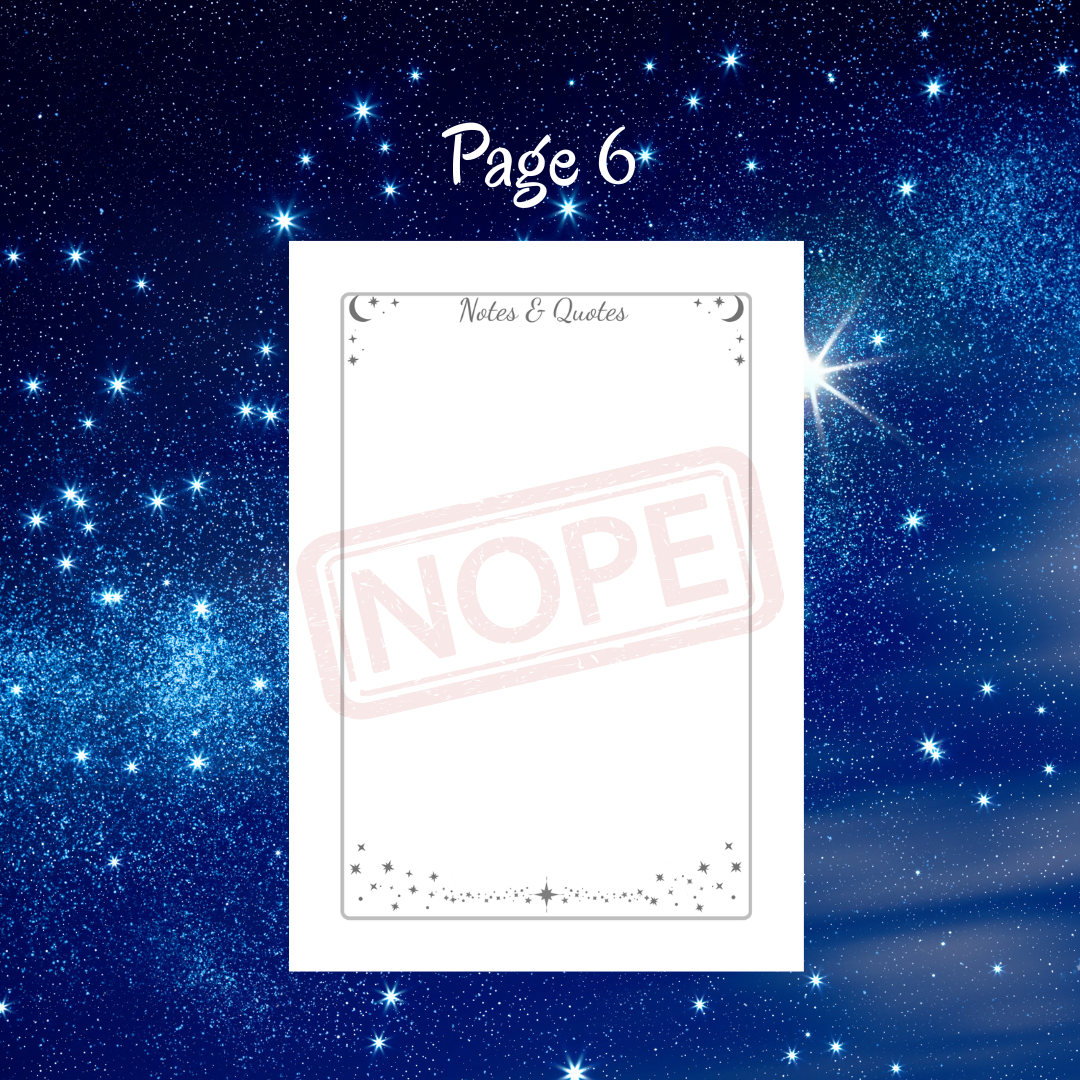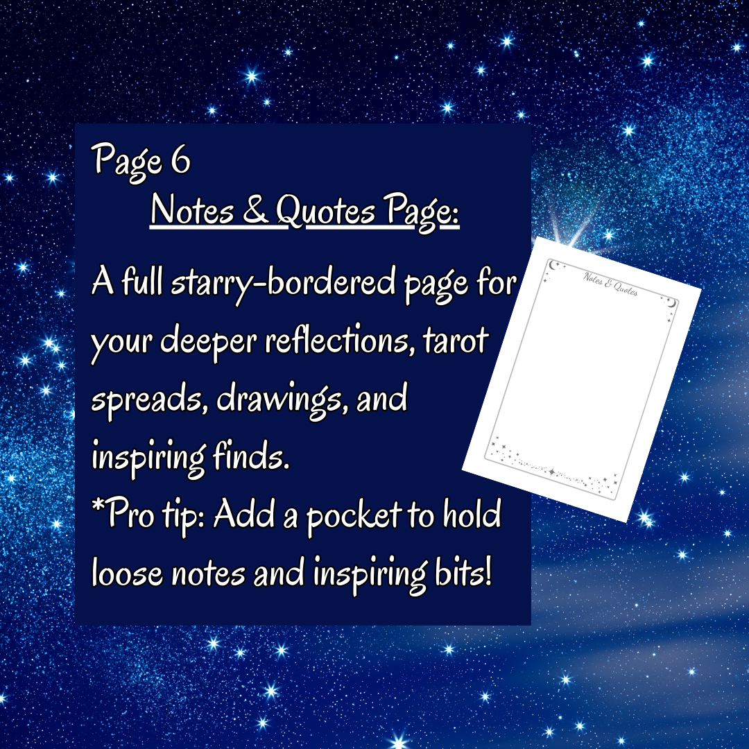 Notes & Quotes Page: A full starry-bordered page for your deeper reflections, tarot spreads, drawings, and inspiring finds. Pro tip: Add a pocket to hold loose notes and inspiring bits!