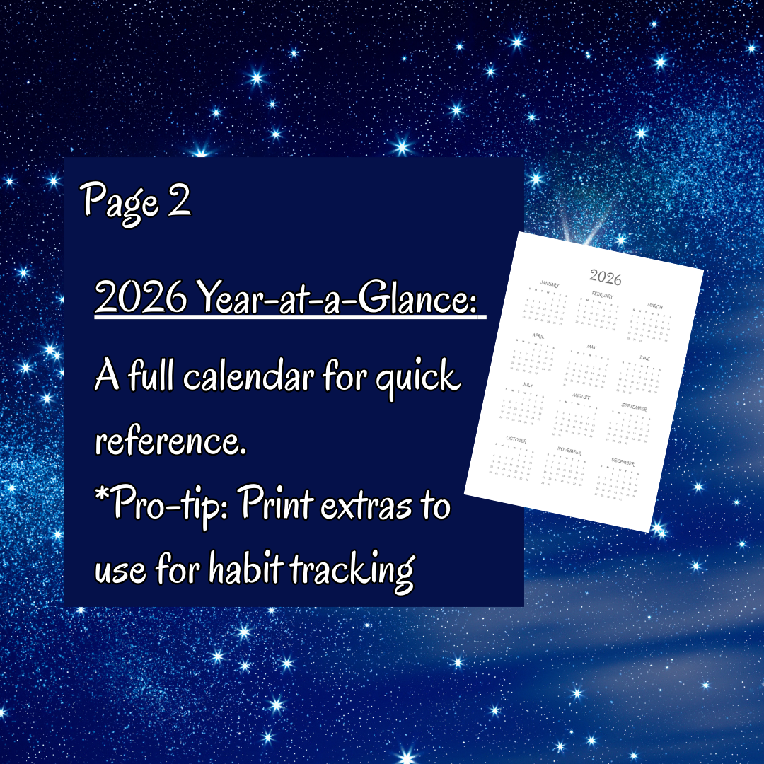 2026 Year-at-a-Glance: A full calendar for quick reference. Pro-tip: Print extras to use for habit tracking