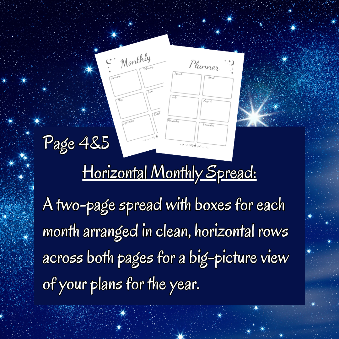 Horizontal Monthly Spread: A two-page spread with boxes for each month arranged in clean, horizontal rows across both pages for a big-picture view of your plans for the year.
