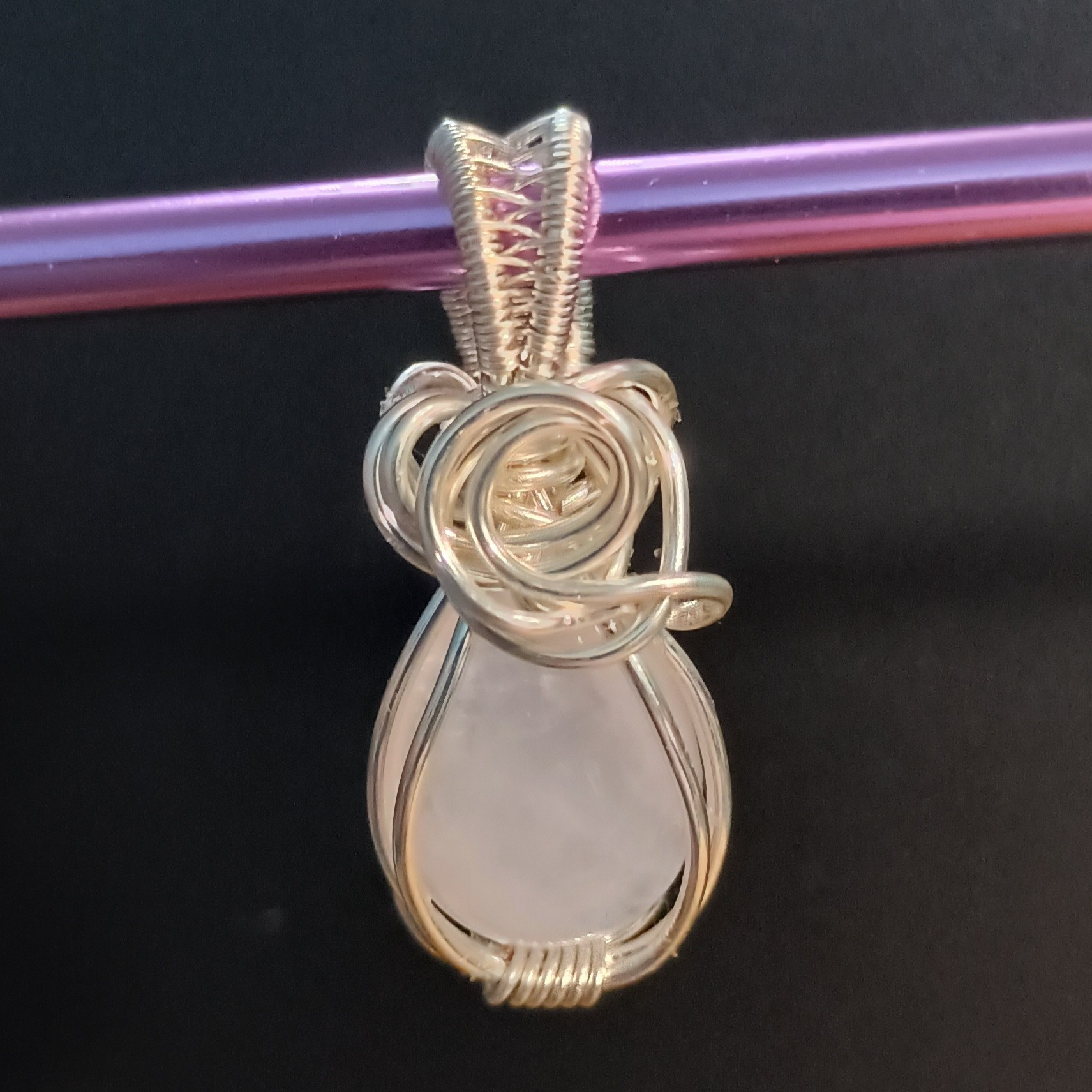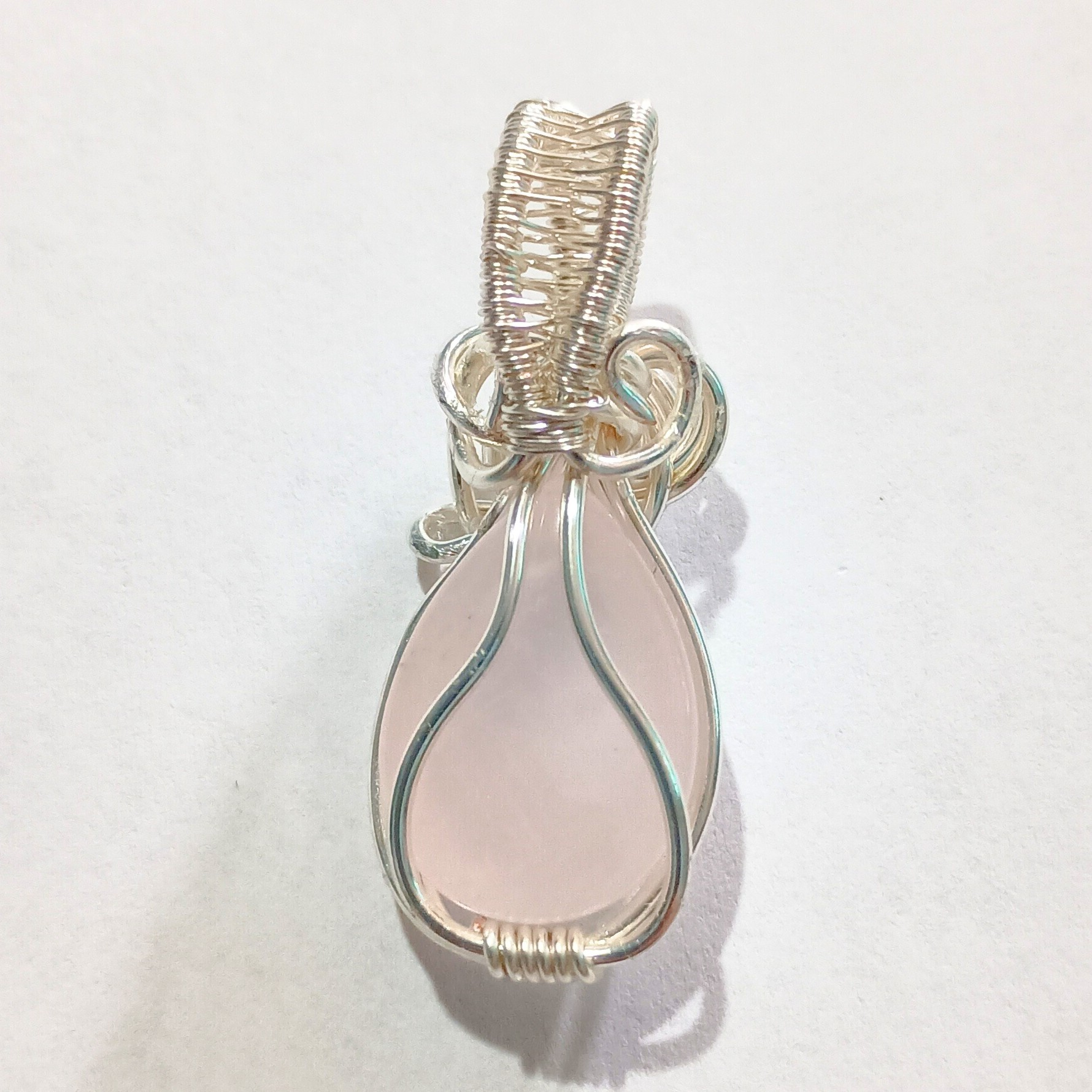 This pendant uses natural rose quartz and is hand-wrapped with tarnish-resistant silver-colored copper wire.