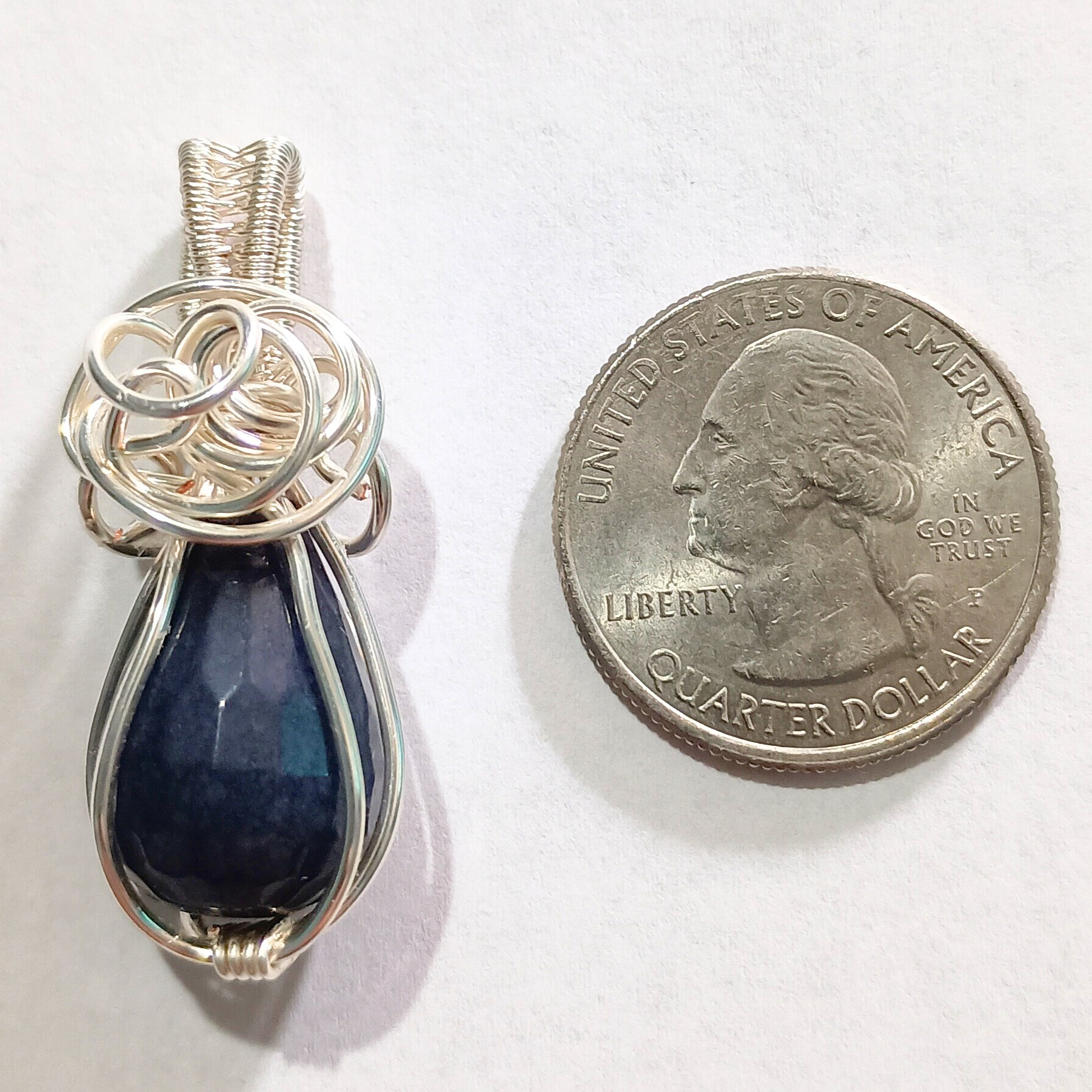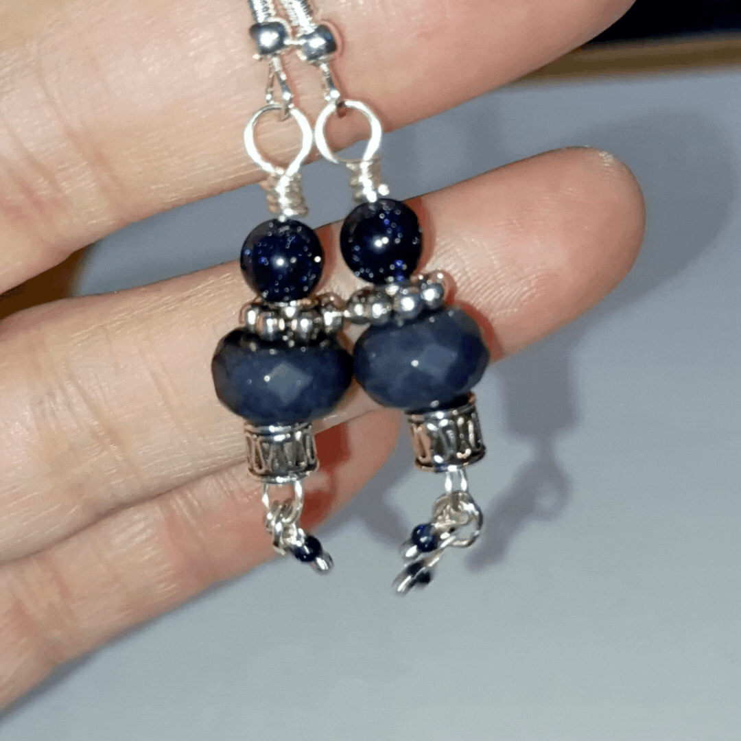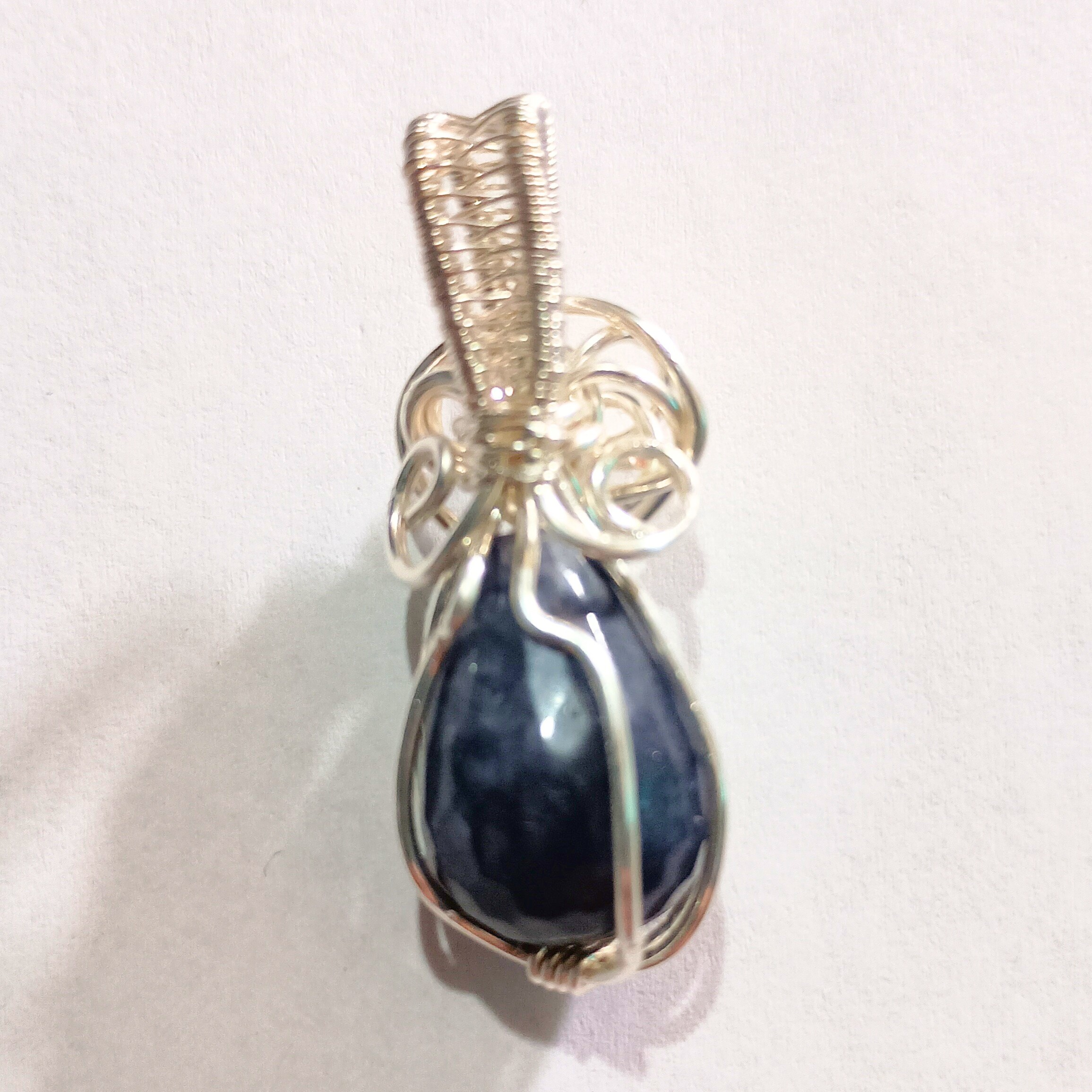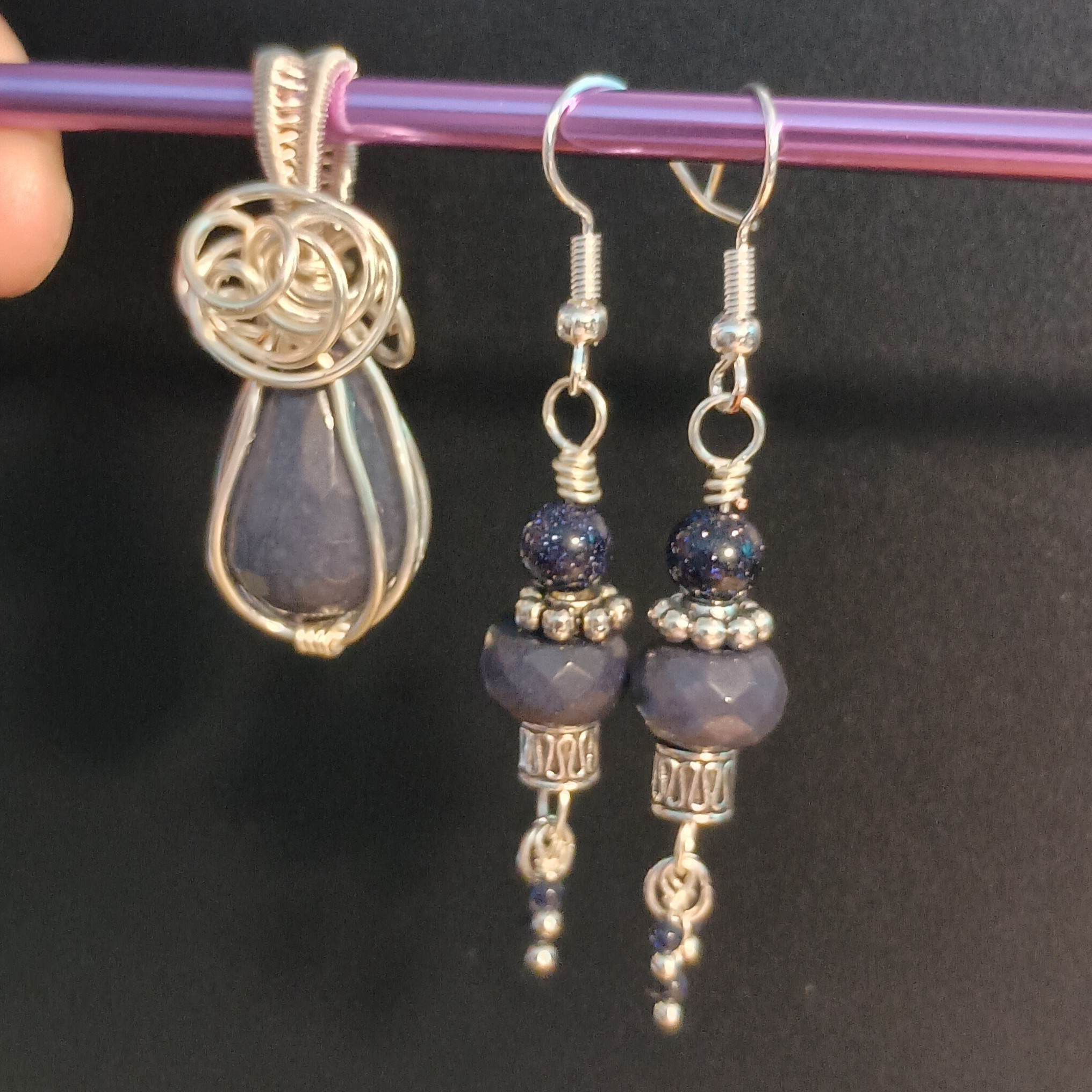 Materials: The Pendant uses natural sugilite and is hand-wrapped with tarnish-resistant silver-colored copper wire. The Earrings use natural sugilite, super sparkly blue goldstone (synthetic), zinc alloy accents, and 925 sterling silver hypoallergenic ear hooks.