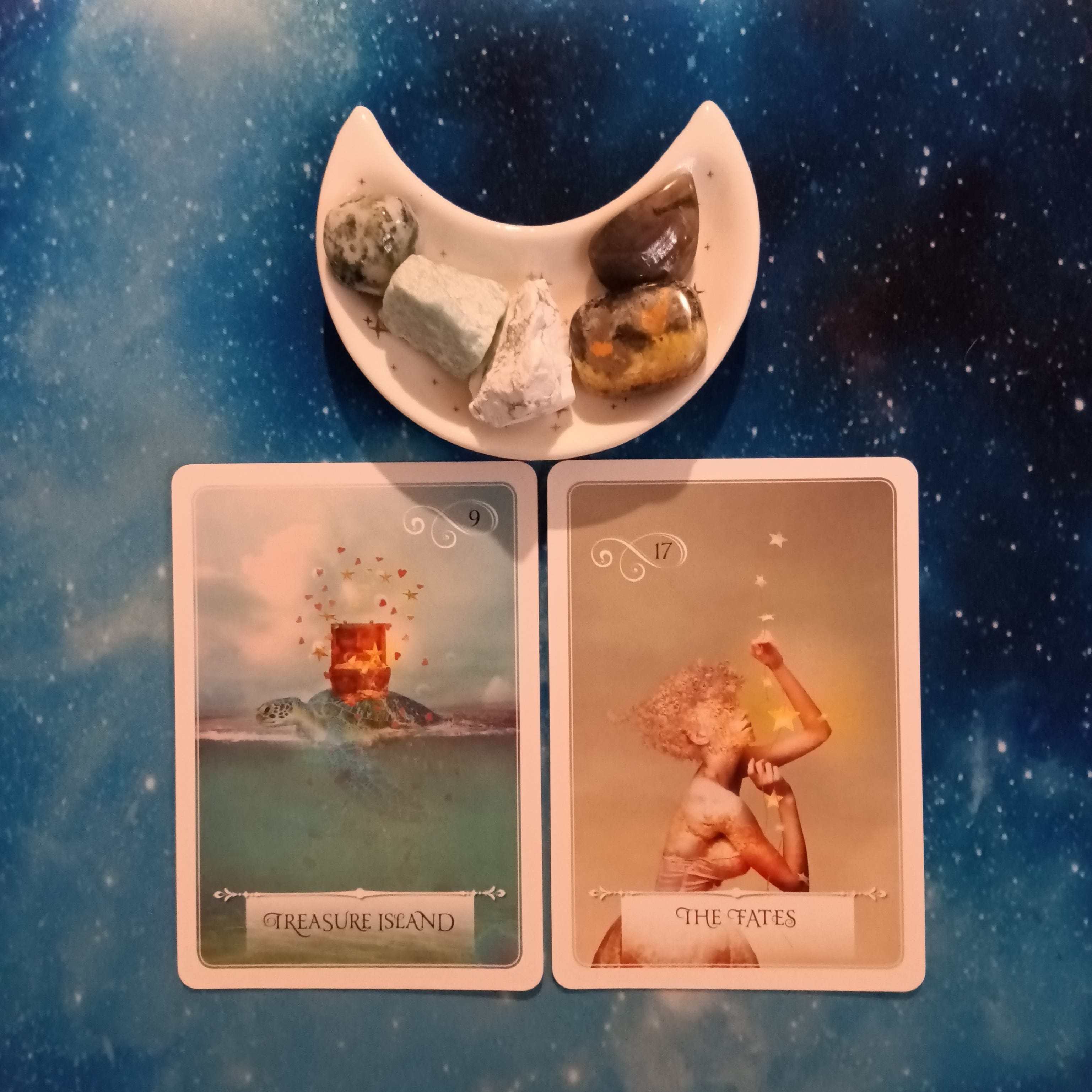 It’s interesting that these two cards came out in the same reading. Treasure Island talks about what you’ve been actively manifesting and The Fates speaks of that which is destined regardless of your thoughts and actions. This, to me, says that whatever you’ve been trying to manifest, your thoughts and actions play a very small role here.