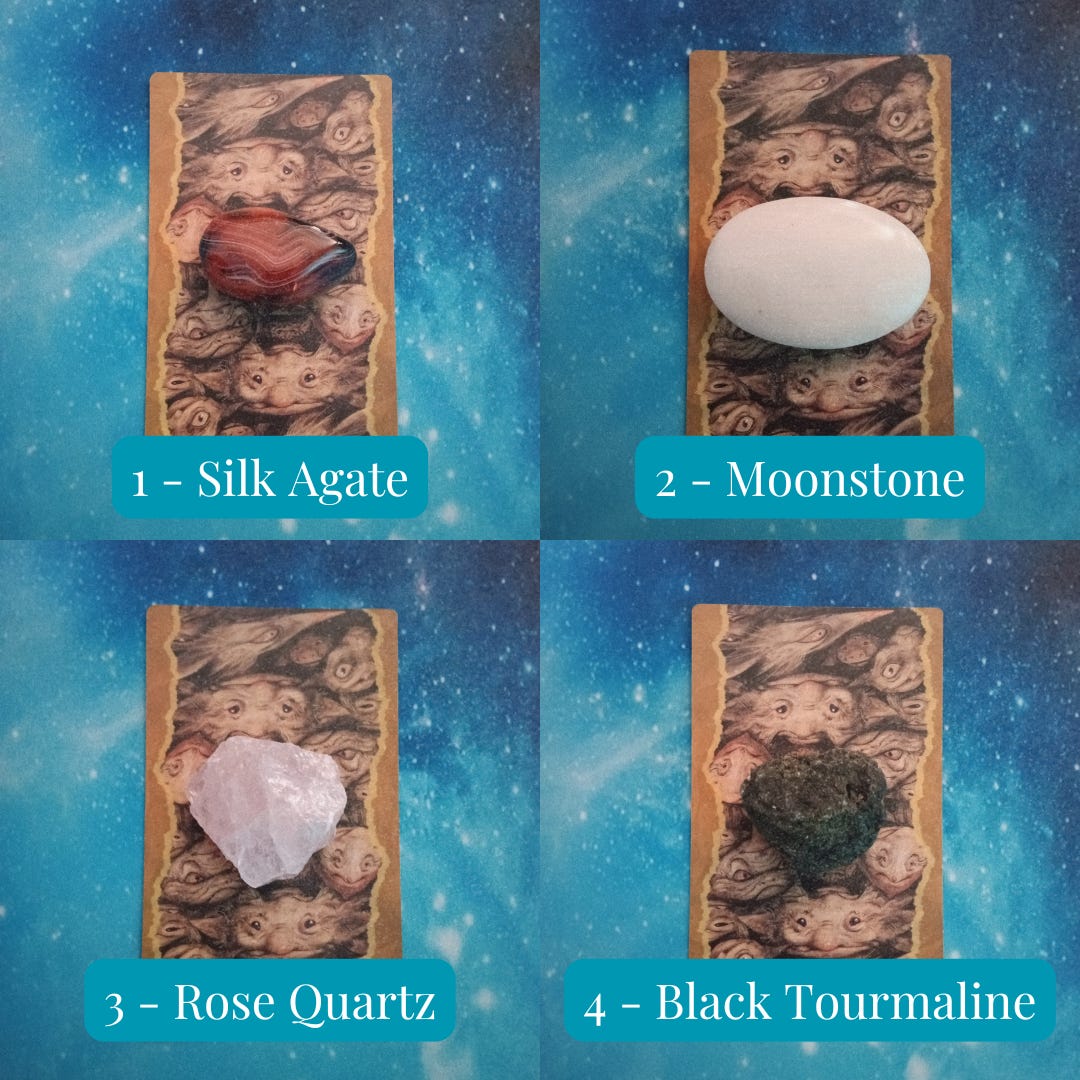 Crystals used: Silk Agate (aka Fire Agate), Moonstone, Rose Quartz, Black Tourmaline